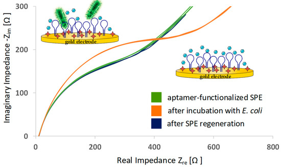 After one biosensing run was done, the aptamer-functionalized SPE was regenerated in a cleaning step with boiling water. Thereby, aptamer structures unfold and potential captured targets (here, whole E. coli) can be released. A subsequent incubation step in aptamer selection buffer allowed the oligonucleotides to fold again in functional conformation and the biosensor was ready for another biosensing experiment. Nyquist plots of EIS indicated that the regeneration step successfully restored the SPE: The electrochemical condition of the regenerated SPE was identical to the status before sample incubation (see Figure 6). Aptamer structures were successfully regenerated.