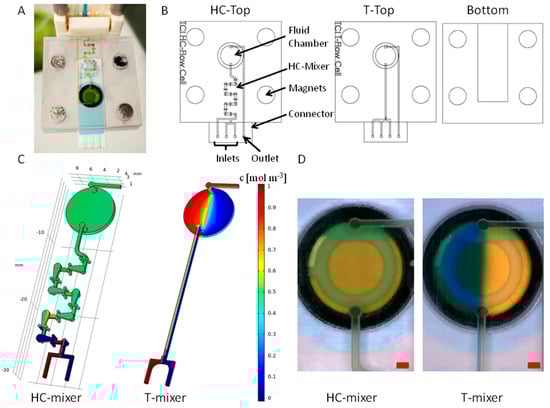 The mixing performance of the integrated micromixer units was analyzed in both by CFD simulation and in practical experiments. For an overview, Figure 7A,B shows a picture of an assembled dynamic flow cell and CAD drawings of the individual parts, respectively. The mixing efficiency was determined by simulation (see Figure 7C). A homogeneous mixing is shown as green (0.5 mol m−3), while no mixing is shown as blue (0 mol m−3) and red (1 mol m−3). After four of seven subunits of the HC-mixer, a homogeneous mixing was evident. The simulation with a T-mixer showed that there was almost no mixing of the liquids within the channel. Therefore, most parts of the liquid chamber appeared blue and red. This is due to the laminar flow present in microfluidic channels, which is why diffusion is the only mixing effect in straight microfluidic channels [58]. These results were confirmed by practical experiments. Since a homogeneous mixing with equal proportions of the solutions used resulted in a neutral pH value, a color change from blue or yellow to green is an indicator of successful mixing. The integration of an HC-mixer resulted in a uniform green color inside of the fluid chamber (see Figure 7A,D). In contrast, the T-mixer showed a mostly two-part segmentation of the liquids (right side is yellow, left side is blue). Between the segments, a narrow, green transition area was visible, which indicates a certain diffusive mixing, but not a homogeneous mixing within the fluid chamber of the flow cell.