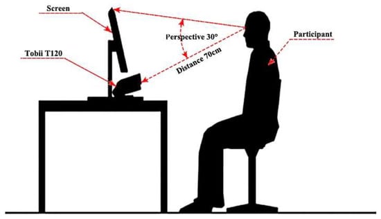 The experiment used the Tobii T120 eye tracker, which is produced by Tobii in Stockholm, Sweden, with a sampling frequency of 1000 Hz and a resolution of the test machine display of 1024 × 768 pixels. The data of eye movement indicators were imported into Tobii Studio software. Figure 1 is a schematic diagram of the Tobii T120 eye tracker setup, and Figure 2 is the participant’s physical eye movement test. The participant’s eyes and the Tobii T120 eye tracker screen were always at a distance of 70 cm, which is approximately at a perspective of 30°.