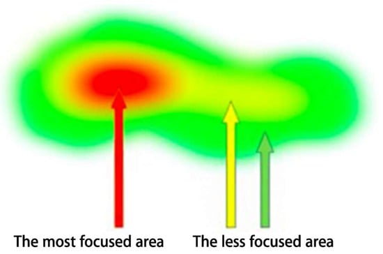 Heat map representing fixation duration and fixation location have been shown to be a better representation of visual processing [44]. It is a visual form that displays visual behavior features by superimposing eye movement data of multiple participants, thus reflecting the distribution of the visual trajectory and visually displaying key areas of visual attention on the interface. In addition to representing the concentration trend and dwell time of watching on the same page, it can also express eye movement patterns as they are superimposed on the same interface [45,46]. Figure 3 is a schematic diagram of a heat map. The focused area is represented by a spectrum of red–yellow–green, with red showing the area of most focus and green showing the area of least focus.