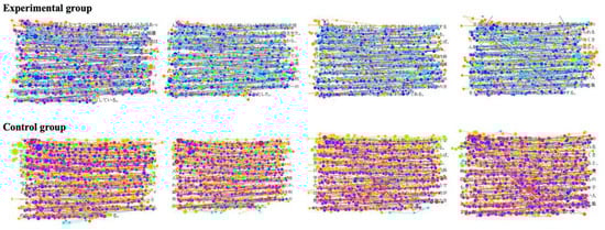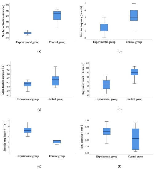 Based on the statistical comparison in Figure 5, t-test was conducted (Table 2). The results show that the number of fixations, fixation frequency, mean fixation duration, and regression count were all significantly lower for the experimental group compared to the control group (number of fixations, t = 13.375, p < 0.001; fixation frequency, t = −4.094, p < 0.001; mean fixation duration, t = 2.663, p < 0.05; regression count, t = 8.062, p < 0.001). In terms of the saccade amplitude, the experimental group was significantly higher than the control group (t = −6.473, p < 0.001). The pupil diameter in the experimental group was larger than that in the control group, although there were no significant differences (t = 1.961, p > 0.05).