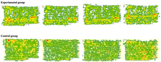 Figure 7 depicts heat maps of all participants for the four Japanese reading articles. For the heat maps of the experimental group, the red hotspot particles were large, and the hotspots were convergent, mainly concentrated in Text Area 1, the keywords and key sentences, and appeared rarely in other parts of the material. In terms of the heat maps of the control group, the red hotspot particles were discrete, and the hotspot areas were less concentrated.