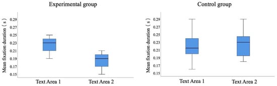 The visual focused areas were compared by detecting the mean fixation duration and fixation location in heat maps. As presented in Figure 6, in this experiment, four Japanese reading articles were delineated into two specific visual areas: Text Area 1 (first specific visual area)—the area of the “keywords and key sentences” section—and Text Area 2 (second specific visual area)—the area of other parts.