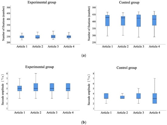 Statistical comparison of the number of fixations and saccade amplitude on four Japanese reading articles for the two groups: (a) number of fixations; and (b) saccade amplitude.