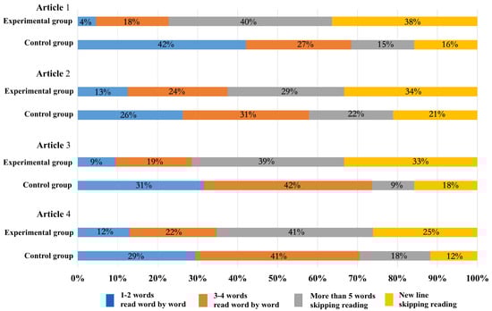 During the reading process, people obtain information through fixations and transferred the fixations through saccades. The saccade amplitude changed due to the difficulty of reading materials. Saccade amplitude in fixation trajectory map indicates the skipping phenomenon. The greater is the saccade amplitude, the more words are skipped [54]. During the reading of Japanese articles, when gazing, readers usually see between two and five (mostly three and four) characters [55]. In this experiment, skipping was defined as five words or more sight moving, or new line sight moving. Figure 11 shows the proportion of the skipping phenomenon in the entire line of sight movement data during the reading process of four Japanese articles in both groups. The results show that the skipping rate in the experimental group was high, at almost 70%, while, in the control group, it was low, at almost 30%. Skipping depends on the difficulty level of the entire article; the lower is the difficulty level of the reading material, the higher is the skipping rate [54]. It indicated that the difficulty level of the reading materials for the two groups was different, and the two groups showed different skipping rate. Reading materials were relatively less difficult for the experimental group, which may be related to the mind mapping training effects. Through mind mapping training, the attention and time used on the reading unit can be reasonably allocated, and key points can be selected for reading to improve students’ reading efficiency [5], which will reduce the reading processing difficulty and make reading process more smooth to a certain extent. Therefore, the saccade amplitude of the experimental group was larger, and the skipping rate was higher than that of the control group.