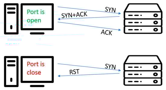 In this paper, TCP full connection technology is adopted to achieve port scanning [,]. The scanning host attempts (using TCP three-way handshake) to establish a regular connection with the designated port of the destination host, as shown in the following Figure 2.