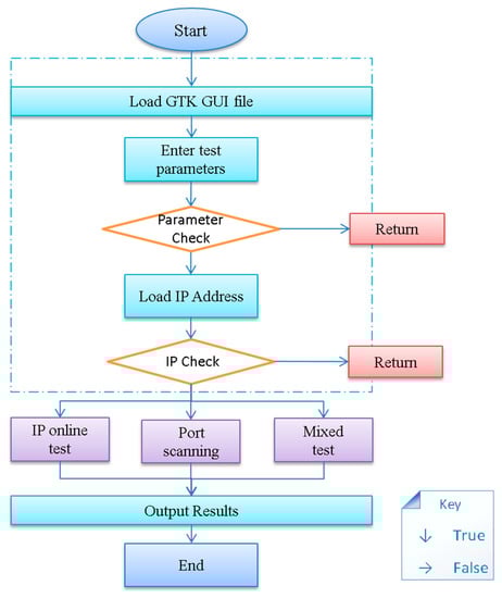 Figure 7 shows the workflow of the system. Due to the separate design of the front and back end, the system first loads the GTK GUI graphic display file. In the process of parameter and IP address verification, a return represents that the user needs to check the input parameters or IP address. The IP address of this program is read from the TXT file.