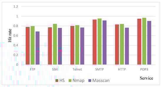 In this experiment, we use the scanning results of Shodan [,] as the standard to scan devices in the Shodan database that provide FTP, SSH, Telnet, SMTP, HTTP, and POP3 services in China. According to the data in the Shodan database on 5 June 2020, there are 1,037,806 devices providing FTP services in China. We chose 10,000 of them to perform the scanning experiment, so the denominator is 10,000, and other protocols also use this configuration. The hit rate is used to evaluate the accuracy of the scanner, its definition is as follows: