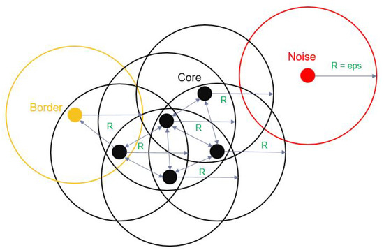 - Ester, M. A Density-based spatial clustering of applications with noise. In Proceedings of the 2nd International Conference on Knowledge Discovery and Data Mining, Portland, OR, USA, 2–4 August 1996; Volume 240, pp. 226–231. [Google Scholar]