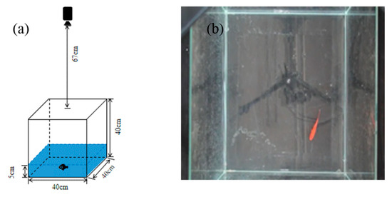 In order to reduce the influence of reflection on photography, a layer of black cloth is placed at the bottom of the fish tank. The size of fish tank is 40 cm × 40 cm× 40 cm. A Sony color camera is placed 67 cm high above the fish tank and it is fixed by a tripod. In order to observe the behavior of fish conveniently, 5.6 L of water is added to the tank. The water level is about 5 cm, and the camera distance is 102 cm away from the water surface. Figure 1 shows the schematic diagram of the experimental device and the effect of actual shooting. The used chemical reagents include ammonium chloride 3.92 g, a box of pH detector and a box of ammonia nitrogen detector. Videos and images are processed by MATLAB 2018a and Python 3.5 under Windows 10, and the process is accelerated by GPU.