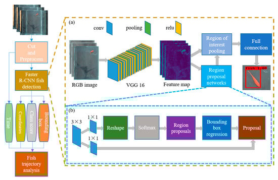 In this section, the fish will be detected by using the Faster region convolutional neural networks (R-CNN) and the Figure 2 shows the recognition process based on Faster R-CNN. The cut and synthesized images are input to the Faster R-CNN and a series of parameters are obtained. These parameters can be processed to obtain the behavior trajectory of the fish. The Faster R-CNN is used to recognize and locate the object, so the Faster R-CNN detector will be introduced in the following part.