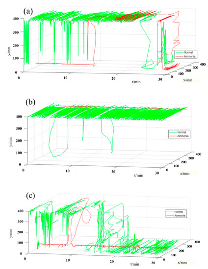 Three experiments were done, and every experiment lasted two days. In three experiments, no any substance was added to the water (i.e., the normal environment) on the first day, and the 0.56 g, 1.12 g and 2.24 g of ammonium chloride was added to the water (i.e., the abnormal environment) in the next day, respectively. In order to make the trajectory clearer to be seen, take only a half-hour trajectory of fish for every experiment. The behavior trajectory of fish is shown in Figure 4. The green curve represents the behavior trajectory of the fish in the normal environment, and the red curve represents the behavior trajectory of the fish in the ammonia environment. As can be seen from the Figure 4, the movement of the fish significantly reduced in the environment with the ammonia compared with the normal environment. For example, the trajectory in the first ten minutes show that the fish was basically stationary in the water in Figure 4a; the fish remained almost motionless for the whole time in Figure 4b; the fish only moved for two minutes and remained motionless in the rest time in Figure 4c. Therefore, we can conclude that fish move much less in ammonium chloride than that in a normal environment.