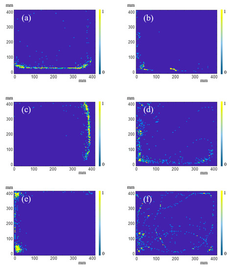 In order to observe the movement of fish directly, a thermodynamic chart of fish trajectory is drawn for the last 10 min of every experiment, as shown in Figure 5. Figure 5a,b is the thermodynamic charts of the behavior trajectory of the fish in the first experiment under the normal environment and the 100 mg/L ammonium chloride environment, respectively; (c) and (d) are the thermodynamic charts of the behavior trajectory of the fish in the second experiment under the normal environment and the 200 mg/L ammonium chloride environment, respectively; (e) and (f) are the thermodynamic charts of the behavior trajectory of the fish in the third experiment under the normal environment and the 400 mg/L ammonium chloride environment, respectively. The color gradient from the blue (corresponding to 0) to the yellow (corresponding to 1) indicates the time change for the stay of fish from short to long, and the yellow points are the positions to stay for the longest time. As can be seen from Figure 5, the movement of fish in ammonium chloride environment is less than that in the normal environment in every experiments.