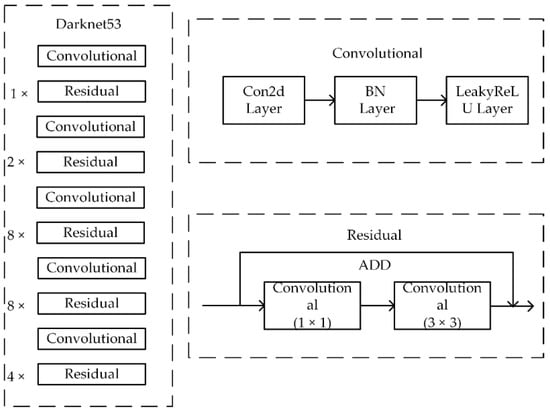 YOLOv3 is an improved version of YOLOv1. The backbone network of YOLOv3 uses Darknet-53 (Figure 3) network, which consists of a total of 23 residual modules. Each residual module consists of two convolutional layers and a shortcut link. These residual modules are divided into 5 groups, and each group contains 1, 2, 8, 8, 4 residual modules.