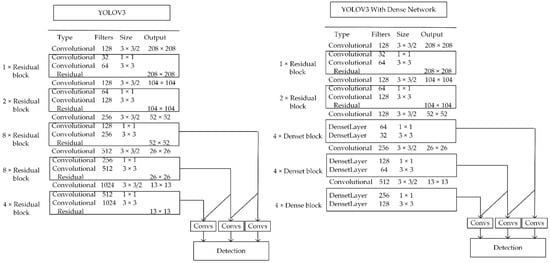 Figure 7 shows the original YOLOv3 structure and YOLOv3 with dense network structure. To balance the detection speed and accuracy, we retain the residual modules of the original network output as 208 × 208 and 104 × 104, the three groups of residual modules with the output of 52 × 52, 26 × 26 and 13 × 13 were replaced with dense modules. Each dense module is composed of 4 dense layers of bottleneck structure. Finally, the network output dimension is consistent with the original network.