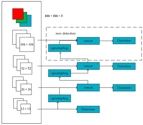 Inside the dashed box, the feature maps of the third detection are up sampled, and then they are fused with the feature maps of 104 × 104 to carry out the fourth detection. In this way, the feature fusion target detection layer that is down sampled by 4 times is established, and the three detection ratios in the original YOLOv3 are expanded to four.
