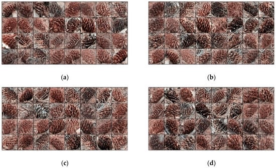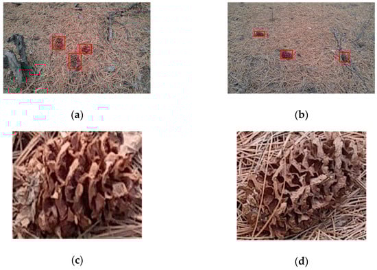 The original image was collected with a resolution of 5312 × 2988 pixels using a camera, and the collected images were manually annotated for experimentation, the place of collection is in the Jiamusi Forest Farm, Heilongjiang, China. The image data were collected on cloudy and sunny days, and the collection time included 8 am, 1 pm and 3 pm. Considering the recognition performance at different angles, some images were collected from different angles at the same location. Eight hundred images of pine cones were collected in the original data set and some of them are shown in Figure 10.
