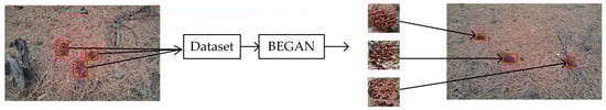 Pine cone detection using deep-learning is a small target and multi-object detection problem. Gathering adequate data into a dataset is critical for any segmentation system based on deep-learning techniques []. At present, there is no public data set of pine cones on the Internet, it is difficult to find sufficient data, so data enhancement technology is necessary. Data augmentation is a common technique that has been demonstrated to benefit the training of machine learning models in general and deep architectures in particular []. Traditional data augmentation methods base on the camera model structure and imaging principles, including rotation, mirroring, translation, random cropping, and affine transformation. These data augmentation methods can improve deep-learning technology to a certain extent [,]. As computer vision develops, scholars have been constantly exploring new ways to enhance image data. The Generative Adversarial Network (GAN) [] designed by Goodfellow et al. provides new solutions. John Atanbori used GAN to generate cassava images to provide missing class training data and developed an efficient cassava counting system []. YC Chou proposed a deep-learning technology combined with GAN to detect defective coffee beans, this method can improve the efficiency of removing inferior coffee beans []. In response to the shortcomings of poor data diversity generated by the original GAN, D Berthelot et al. designed BEGAN based on the idea of equilibrium, which improved the ability of GAN network data augmentation to a new level []. The images generated by BEGAN are high quality and effectively improve the prediction performance of the model [,].