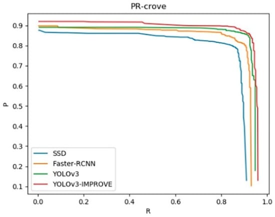 The precision-recall (P-R) curve obtained from the recall rate and accuracy during training is shown in Figure 14, the P-R curve of the improved YOLOv3 model has obvious advantages over other models, and its balance point is closer to the coordinates (1,1), which it shows that the performance of the model is higher.