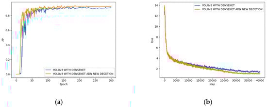 After the introduction of dense modules in the backbone network of YOLOv3, the calculation work of the model is significantly reduced. The YOLOv3 operation amount after the introduction of dense modules is 40.48 BFLOPs, while the original YOLOv3 operation amount is 65.86 BFLOPs, this is the major reason behind the increase of detection speed. As shown in Figure 15, the Average Precision (AP) value of the YOLOv3 model introduced by the dense module is similar to that of the original YOLOv3 model, which shows that the introduction of the dense module has little effect on the detection accuracy.