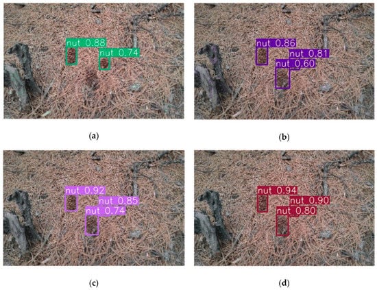 Detection result: (a) YOLOv3; (b) YOLOv3 with DenseNet; (c) YOLOv3 with DenseNet and four detection; (d) YOLOv3 with DenseNet, four detection and DIoU loss.