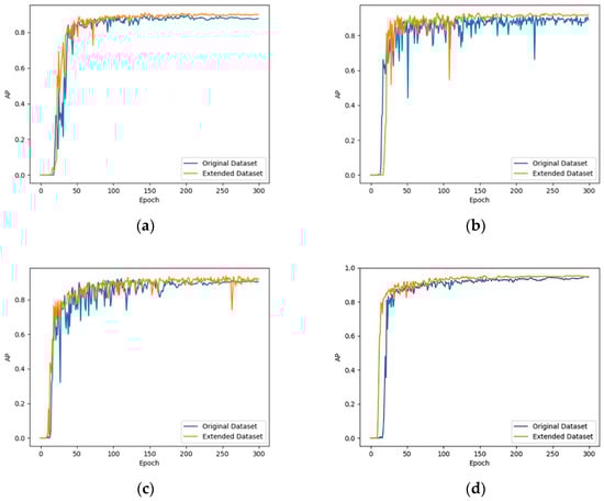 AP curve for original dataset and extended dataset: (a) SSD; (b) Faster R-CNN; (c) original YOLOv3; (d) improved YOLOv3.