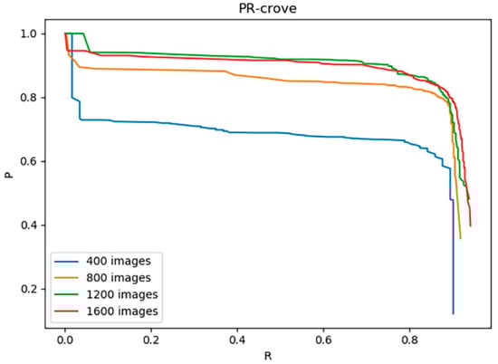 To further analyze the influence of the size of image data set on the model. Based on the data set enhanced with BEGAN, we selected 400, 800 and 1200 images randomly to form a new data set and trained the improved YOLOv3 model on these data sets to obtain the corresponding P-R curves (Figure 20). The experimental results show that the size of the data have a great influence on the detection ability of the model. When using a 400-image data set, the detection ability of the model is very weak. As the size of the training set increases, the detection performance of the model gradually increases. In addition, the ability to improve data augmentation is limited. When the number of training set images exceeds 1200, as the number of images increases, the speed of model performance improvement begins to slow.