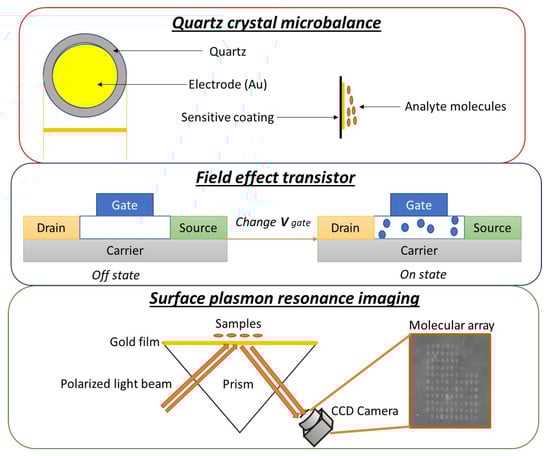 - Piezoelectric sensors: piezoelectric crystals can be used in different fields, including optoelectronics, electronics, liquid, and gas detection devices. Two kinds of piezoelectric sensors are used in gas sensing: surface acoustic wave (SAW) and quartz crystal microbalances (QCMs). The working principle is that a change in the mass of the piezoelectric sensor coating, caused by absorption of a volatile, gives a change in the resonant frequency. An input (transmitting) and output (receiving) interdigital transducer deposited on the top of the piezoelectric substrate are present in SAWs. The sensitive element is between the transducers, an acoustic two-dimensional wave propagates since potential is applied to the input transducer; frequencies are in the 100–400 MHz range [35,36]. Quartz crystal microbalances (QCM) are the most used piezoelectric sensors and are of great importance in fields as material science, environmental monitoring, electrochemistry, and biosensors. They are generally realized with an ‘AT cut’ quartz layer having 2 gold electrodes on each side; the crystal is forced to oscillate at the fundamental frequency using an alternating current [37]. When an external electric field is applied to the quartz, the frequency decay is proportional to the mass bound to the crystal [38]. The relationship between frequency change and film deposition efficiency that interacts with different VOCs is expressed by the Sauerbrey equation [39]. These sensors can be easily modified with biological elements using techniques such as drop-casting, spin coating and dip coating. The ease of realization, low costs, ability to work in real-time and the short analysis times make this type of transducers very attractive in the sensors field [40].