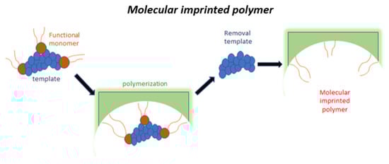 Molecularly imprinted polymers (MIPs) are cross-linked synthetic materials with artificially generated recognition sites able to selectively bind a target molecule [85]. Molecular imprinting involves the preparation of a “mold”, that is achieved using monomers that are polymerized around the target compound. After polymerization, the target molecule is removed by extensive and specific washing steps to leave recognition sites that are supposed to be complementary to the model molecule in terms of size, shape, and position of the functional groups. The synthesis of MIPs is relatively cheap and simple: basically, it requires the target molecule, one or more functional monomers, a cross-linker, an initiator, a porogenic solvent, and a solvent for mold extraction after complex polymerization. Different strategies for the realization of the MIPs can be carried out depending on the nature of the target molecules and the envisaged use of the MIPs within the assay format (i.e., for solid-phase extraction or sensor surface modification). These approaches and the use and classification of MIPs (often reported as ‘plastic antibodies’) have been extensively studied and reviewed in the literature [86,87,88]. Figure 3 shows a graphical schematization of the MIPs assembling.