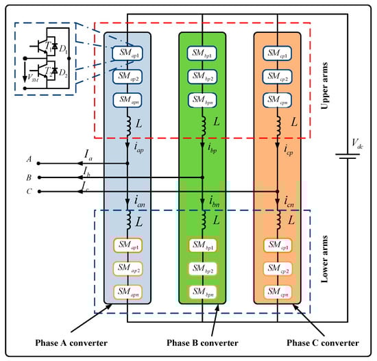 Figure 1. Structure of a three-phase modular multilevel converters (MMC) with half-bridge submodules.