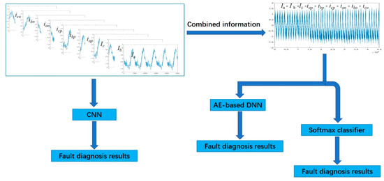 This paper proposes three methods to complete both the fault detection and classification task for MMC, as shown in Figure 3, which are CNN, AE-based DNN, and a stand-alone SoftMax classifier. CNN processes the raw sensors data, which are nine current signals (Ia, Ib, Ic, iap, ibp, icp, ian, ibn, and icn) and obtains the fault diagnosis results. AE-based DNN and SoftMax process the combined information that is concatenated the measurements of these nine parameters, to form a vector of samples that represent the current health condition of the MMCs, and then obtain the fault diagnosis results.