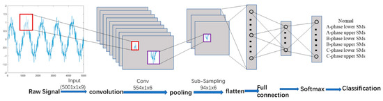 Figure 4 illustrates the architecture of CNN for fault detection and classification. The input data is the raw sensor signals. Each channel denotes one sensor, which records 5001-time samples. Therefore, the size of input current signals is [5001 × 1 × 9], where the length is 5001 and the height is 1, as the signals are one dimensional, and the depth is 9, as the signals come from 9 channels. The input is convolved with 6 filters of size 1 x 30 with stride 9 and padding 3, then applied a leaky ReLU function, in which the scalar multiplier for negative inputs is set as 0.01, resulting in a new feature map of size 554 × 1 and 6 channels. The sequence is pooling operation, which is applied to each feature map separately. Our pooling size is set 6 × 1 and stride is 6. Therefore, a convolution feature map is divided into several disjoint patches and then the average value in each patch is selected to represent the patch and transmit to the pooling layer, then the feature map is reduced to 94 × 1 by the pooling operation.