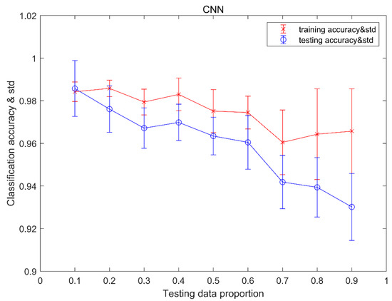 The classification results of training and testing data using convolutional NNs are shown in Figure 6. From the viewpoint of trending, we can see that, with the testing data proportion increases, both classification accuracy for training data and testing data decline. For the training dataset, the standard deviation of classification accuracy increases with the increase of the testing data proportion. For testing data set, the maximum of mean accuracy is 98.6% with testing data proportion of 0.1 and the minimum of the average accuracy is 93.0% with testing data proportion of 0.9. The standard deviation of classification accuracy in the middle of the testing data proportion is smaller than both ends of the testing data proportion. Moreover, for each testing data proportion, the standard deviation of classification accuracy for the training data set is less than the standard deviation of classification accuracy for the testing data set.