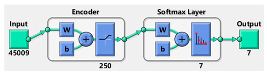 The algorithm used for training the autoencoder applied scaled conjugate gradient descent (SCGD). The maximum number of training epochs for this autoencoder is set as 10. Third, the 250 features achieved by trained AE are used as the input of the SoftMax classifier. The maximum number of training epochs for the SoftMax classifier is set as 20. Next, we stacked the trained AE and SoftMax classifier into a deep NN. Finally, we trained this deep NN using the training data. The structure of deep net is shown in the Figure 7. The maximum number of epochs for training this deep net is set to 1000.