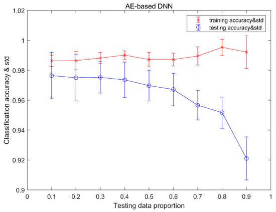 Figure 8 shows the classification results of training and testing data using AE-based DNN. From the viewpoint of trending analysis, we can see that with the testing data proportion increase, the classification mean accuracy for testing data declines, but the classification accuracy for training data increases. For the training data set, the highest average accuracy is 99.5%, with a testing data proportion of 0.8, and the lowest is 98.6%, with a testing data proportion of 0.1. The standard deviation of classification accuracy increases with the increase of the testing data proportion. For the testing data set, the max of mean accuracy is 97.6%, with the testing data proportion of 0.1, and the minimum of mean accuracy is 92.1%, with a testing data proportion of 0.9. The standard deviation of classification accuracy in the middle of the testing data proportion is smaller than both ends of the testing data proportion. We can also see that, for each testing data proportion, the standard deviation of classification accuracy for the training data set is less than the standard deviation of classification accuracy for the testing data set.