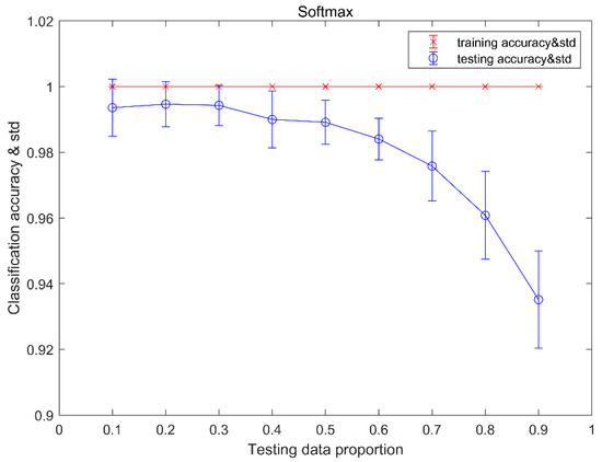Figure 9 shows the classification results of training and testing data using the SoftMax classifier. From the trending view, we can see that, with the testing data proportion increases, the classification average accuracy for testing data declines, but the classification average accuracy for training data keeps steady at 100%. The standard deviation of classification accuracy in the middle of the testing data proportion is smaller than both the end of testing data proportion for testing data set, but the standard deviation of classification accuracy is 0. For testing data set, the highest average accuracy is 99.5%, with a testing data proportion of 0.2, and the lowest average accuracy is 93.5%, with a testing data proportion of 0.9. It is obvious to see that for each testing data proportion the standard deviation of classification accuracy for training data set is less than the standard deviation of classification accuracy for testing data set.