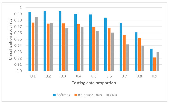 From Figure 10, we can see that the SoftMax classifier behaves outstandingly on the testing data proportion from 0.1 to 0.9 compared to CNN and AE-based DNN. When the testing data proportion is 0.1, 0.2, and 0.9, which locates both ends, the classification accuracy of CNN is better than the AE-based DNN.
