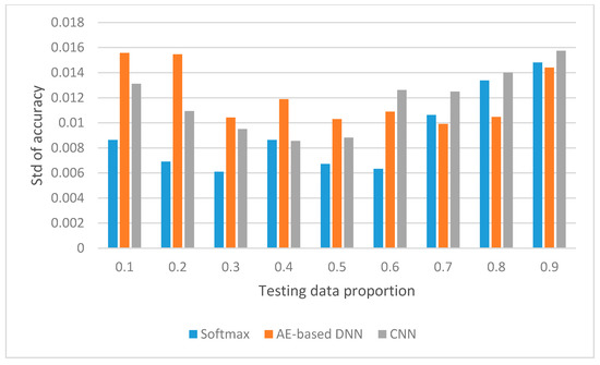 We know that, in statistics, the standard deviation is a measure that is used to quantify the amount of variation or dispersion of a set of data values. A low standard deviation indicates that the values tend to be close to the expected value of set, while a high standard deviation indicates that the values are spread out over a wider range. From Figure 11, it is clear that the standard deviation of accuracy of SoftMax is lower than other methods when the testing data proportions are in the range of 0.1 to 0.6. This implies that, for every run for different training data set and testing data set, the classification accuracy of SoftMax is more stable and other methods are more spread out. When the testing data proportion varies from 0.7 to 0.9, the AE-based DNN has the lowest standard deviation. AE-based DNN is the most spread out when the testing data proportion is from 0.1 to 0.5, and CNN is the most spread out when the testing data proportion is from 0.6 to 0.9.