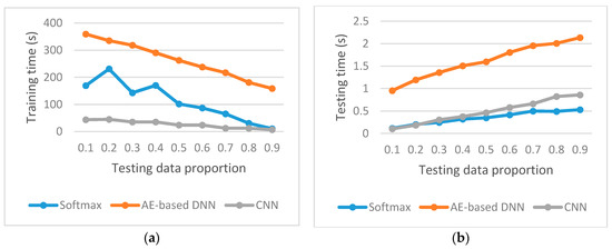 Figure 12 describes the training time and testing time spent by three methods. It shows that, for each testing data proportion, the AE-based DNN spends more training time than other methods, and the CNN spends the least training time, and the SoftMax takes the least testing time when the testing data proportion varies from 0.3 to 0.9, and the AE-based DNN spends the most testing time.