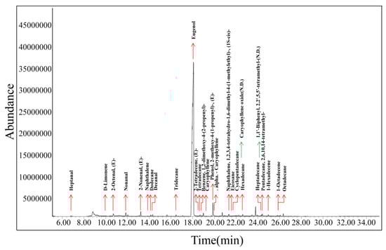 There are few reports in the literature on the volatile compounds in biofilms. HS-SPME-GC-MS was applied to determine the diversities of volatile constituents in the biofilm samples with different eugenol concentrations and to validate the results of E-nose experiments. The GC-MS spectrum of volatile compounds released by the E-5 biofilm is shown in Figure 2. Twenty-seven compounds were identified, comprising nine (9) alkanes, eight (8) olefins, five (5) aldehydes and five (5) aromatic compounds (Table 2). With the increasing eugenol concentration in the biofilms, the species of volatile components did not vary significantly. The aromatic compounds with eugenol as the main component had an obvious growth trend in low concentration films. However, the relative concentration of eugenol reached a higher level from E-20, and it tends to be stable in the biofilms with higher eugenol concentrations due to saturation effect. As a result, the relative concentrations of alkanes, alkenes and aldehydes were reduced. The change trend of alkanes, alkenes, aldehydes, aromatic compounds and eugenol in different eugenol biofilms are shown in Figure 3. Among them, dextroterpene diene, 2-tetradecene, 1-hexadecene, heptanal and decanal gradually decreased or even disappeared as the concentration of eugenol in the biofilm increased.