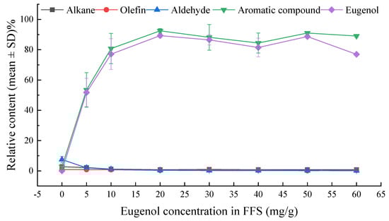 The relative concentration of alkanes, olefins, aldehydes, aromatic compounds and eugenol in different eugenol- curdlan (CD) biofilms.