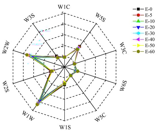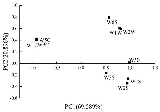 Figure 7 shows the load analysis diagram of the sensor response values of biofilm samples of different eugenol concentrations. The diagram was used to evaluate the contribution value of the arrays of sensors used to differentiate the odor changes of the biofilms containing different eugenol concentrations. According to the figure, except for sensors of W1C, W3C and W5C, the scores of other sensors on PC1 were more than 0.5. The contribution of sensors of W5S, W1S and W2S on PC1 were greater than that of PC2 (with values greater than 0.9), while the contribution of sensors of W6S, W1W and W2W on PC2 were greater. Although the contribution rate of PC1 was higher than that of PC2, the contribution rate of PC2 was not lower, so the contribution of PC1 and PC2 should be considered comprehensively. According to the load diagram of the sensor response values of biofilms with different eugenol concentrations, the contributions of W1C, W3C and W5C sensors on PC1 and PC2 was little, implying their ineffectiveness in identifying the odor changes of biofilms with different eugenol concentrations. For the remaining sensors, the load factor scores of W6S, W1W, W2W and W5S, W1S, W2S were comparable, indicating a strong correlation between the sensors and the similarity of their recognition effects. There might be data overlap and further optimization and screening may be required.
