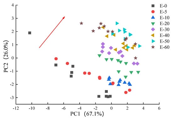 Pattern recognition can provide direct and easily understood qualitative and semi-quantitative data. PCA is a projection approach used for reducing the dimensionality of data, calculating a number of variables that best describe the differences between the samples and are arranged according to the contribution rates (called principal components (PCs)) [,]. In order to determine the effectiveness of the E-nose technique to detect and differentiate biofilms of different eugenol concentrations, PCA was used to process the data of 10 different sensors in order to reduce the complexity of the data. As shown in Figure 5, the contribution rate of the first principal component (PC1) was 67.1% and that of the second principal component (PC2) was 26%. The result showed that biofilms with large differences in eugenol concentrations could be effectively discriminated, but there were overlaps between adjacent samples, especially the E-60 biofilm that could not be separated from other biofilms. Because PCA only fits a handful of samples at a time, when the number of biofilm samples to be measured increases, the biofilm samples with different eugenol concentrations will become crowded and not easily distinguished especially in adjacent samples in the PCA chart []. However, in general, the distribution trend of the sample membranes with different concentrations was shown with the red arrow.