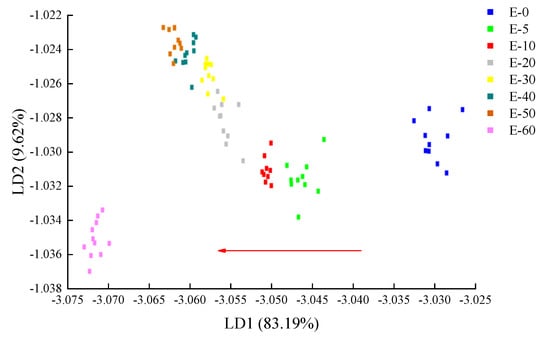 To further investigate E-nose data, a qualitative discriminant model was established using LDA to quickly discriminate biofilms with different eugenol concentrations. LDA is a statistical method that can determine which group the sample belongs to by maximizing the variance between categories and minimizing the variance within categories []. As shown in Figure 6, the total LDA contribution of eugenol biofilm was 92.81%, which was slightly lower than the PCA analysis (93.1%). However, in the LDA analysis, the degree of dispersion between the active biofilm samples was greater than that of the PCA analysis, which was effectively used to differentiate biofilms of different eugenol concentrations. Based on eugenol concentration in the biofilms, the samples were distributed from large to small along the LD1 side as indicated with the red arrow. The above results provide a reference for further differentiation.