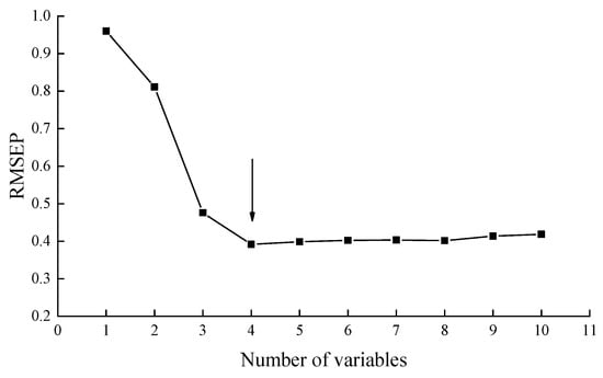 Root mean square error of prediction (RMSEP) of number of variables selected by successive projection algorithm (SPA).
