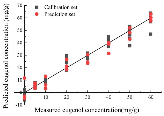 The prediction models of all and featured sensors based on PLS and SVM algorithms for the determination of eugenol concentration in biofilms were established using 80 samples (calibration set: prediction set = 7:3) after pre-processing using the auto scale algorithm. The number of latent variables (LVs) of PLS was 10. The SVM model adopted for the study entailed mainly the use of the radical basis function as the SVM kernel type, which has the loss function epsilon (0.01), the penalty coefficient C (100) and the kernel factor γ (0.0316). The results of the model prediction are shown in Table 3, which indicate that all models are effective for predicting eugenol concentrations (R2p > 0.89, RPD > 3). In terms of effectiveness of the modeling methods, the PLS model was superior to SVM in predicting eugenol concentration based on both all sensors and featured sensors. The prediction effect of featured sensors modeling in SVM prediction model was better than that based on all sensors, but the prediction effect in PLS model was contrary. It indicated that the SPA algorithm might eliminate a small amount of effective information while reducing redundant information, thus affecting the accuracy of the model. The number of E-nose sensors is smaller than the number of spectral wavelengths, and this enhances the speed or rapidity of the prediction model based on all sensors. Therefore, the prediction model of eugenol concentration in biofilms based on all sensors is more reliable to retain the original information and improve the prediction accuracy. In summary, the optimal prediction model for eugenol concentration in biofilms was achieved by the PLS prediction model based on all sensors, with R2p of 0.952 and RMSEP of 4.612 mg/g (Figure 9). The R2p in this experiment was close to or even higher than the values reported in the literature [,], which proved that the quantitative prediction model based on E-nose for eugenol in biofilms was effective.