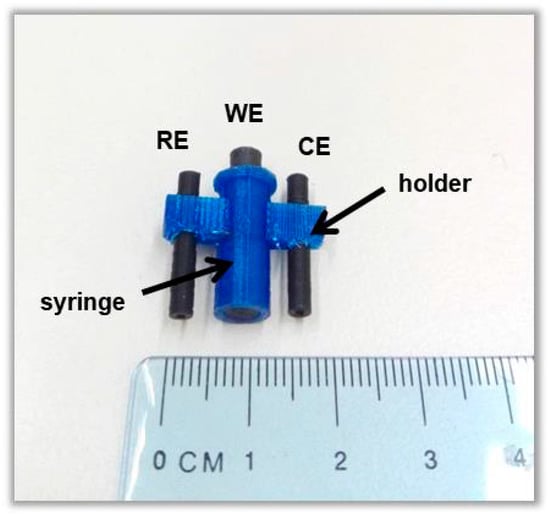 A photograph of the 3D-printed sensor is presented in Figure 1. The device was designed with Tinkercad software, while Flashprint software was used for the printing process, applying a temperature of the platform: 60 °C, temperature of head dispensers: 200 °C, and printing speed: 70 mm s−1. For the fabrication of the graphite paste electrode modified with the Ca-MOF, 0.30 g graphite powder (grade #38, Fisher Scientific, Athens, Greece), 60 mg of Ca-MOF, and 0.10 g paraffin were mixed in a mortar. The resulting paste was transferred to the 3D-printed syringe, and a 3D-printed conductive plunger was used as an electric connector. Similarly, unmodified GP electrodes without Ca-MOF were also fabricated for comparison purposes.