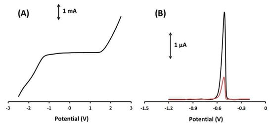 (A) LS voltammograms of the 3D-printed Ca-MOF device in 0.1 mol L−1 acetate buffer (pH 4.5). Scan rate, 50 mV s−1. (B) DP voltammogram of 20 µg L−1 of Pb(II) (black line) obtained with the modified GPE with Ca-MOF and DP voltammograms of 20 µg L−1 of Pb(II) (red line) obtained with the bare GPE in 0.1 mol L−1 acetate buffer (pH 4.5).