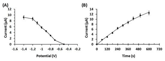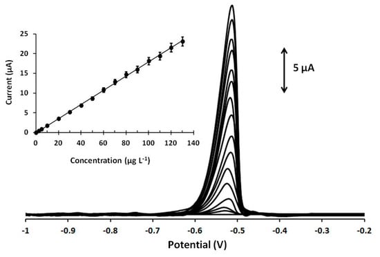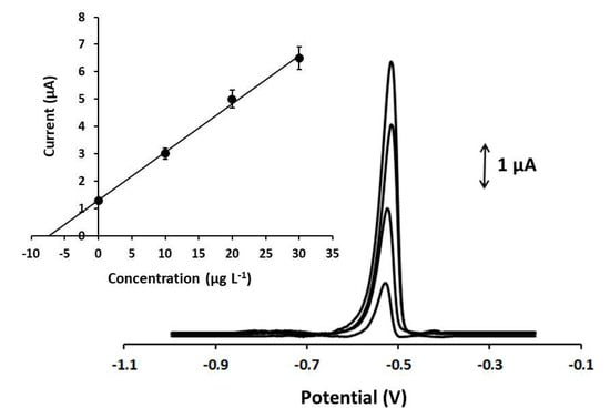Regarding the effect of the electrolytic preconcentration time on the DPASV sensitivity of Pb(II), it was tested in the range of 0–600 s (Figure 3B). The peak current increased in a rectilinear fashion with respect to the preconcentration time: at lower preconcentration times, the peak current increased rapidly (from 60–360 s), while at longer preconcentration times (higher than 360 s) the rate of increase dropped. A preconcentration time of 360 s was selected for further experiments, as an optimum compromise between high sensitivity and fast analysis.