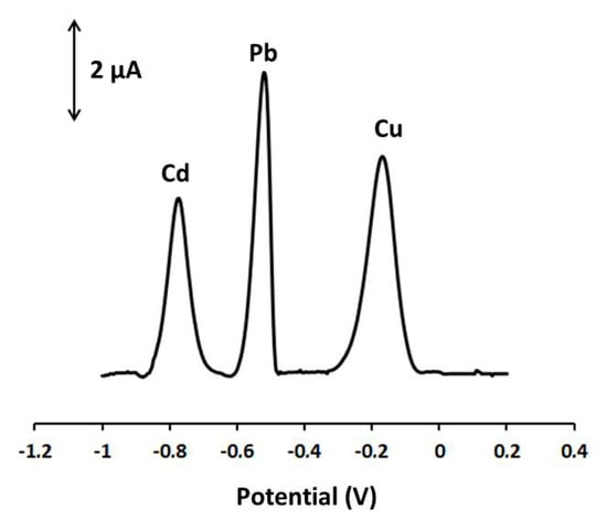 DP voltammograms at the Ca-MOF/GPE of 40 µg L−1 Pb(II), 80 µg L−1 Cd(II), and 80 µg L−1 Cu(II) in 0.1 mol L−1 acetate buffer (pH 4.5). Preconcentration potential: −1.2 V; preconcentration time: 360 s; pulse 40 mV for 10 ms; scan rate: 10 mV s−1.